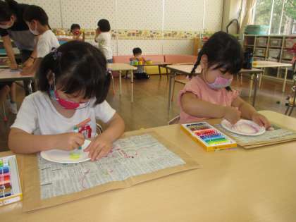 たんぽぽ組は、カタツムリの殻になる紙皿にクレヨンで模様を描きました。好きな色を選んで、グルグル、グルグル…。♪でんでんむしむしかたつむり〜♪カタツムリの歌を歌いながら楽しんでつくりました。