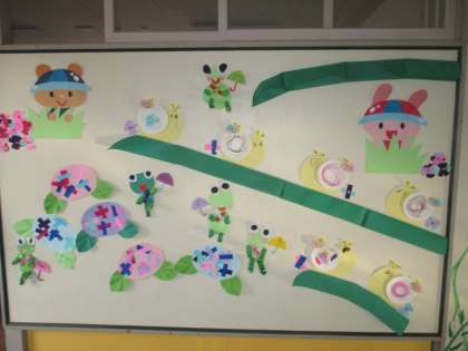 ひまわり組は、折り紙を細く切り、小さな花になるように重ねてアジサイの台紙に貼っていきました。ハサミの使い方も上手になり、素敵な花が完成しました。