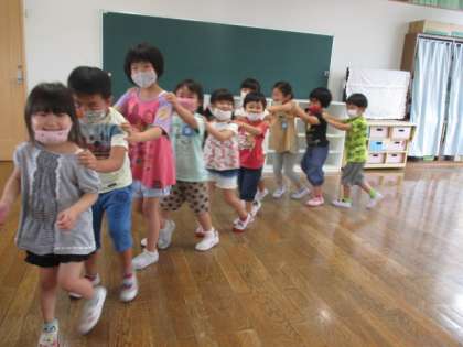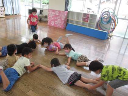 2階の部屋でたんぽぽ組とひまわり組で遊びました。「久しぶりだね!」「何して遊ぶ?」と嬉しそうに話をして遊びを決め、じゃんけん列車や大根抜きゲーム等を楽しみました。