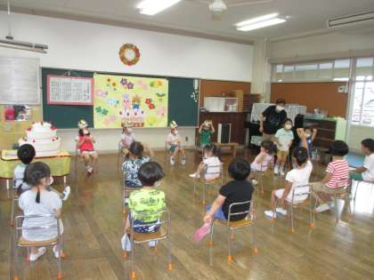 今年度初めての誕生会。4・5月生まれのお友達、お待たせしました。5歳児のお友達の司会で誕生会が進み、みんなで歌を歌ったり、拍手をしたりしてお祝いをしました。質問コーナーでは、好きなアイスクリームやジュースを聞かれ「バニラアイスが好き」「いちごジュースです」などちょっと恥ずかしそうに答える友達もいました。みんなにお祝いをしてもらって嬉しかったね。お楽しみコーナーでは元気いっぱい「サンサン体操」を踊りました。