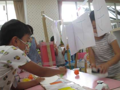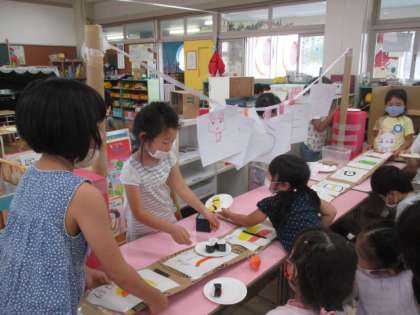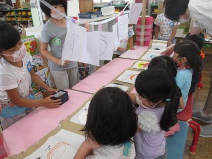 うさぎ組では、先月からお寿司屋さんの開店に向け、5人で力を合わせて準備を進めてきました。先日、ようやく開店し、この日は、たんぽぽ、ひまわり組の友達や園長先生を招待しました。いざ、招待してみると...お客さんから、たくさんの注文を受け、驚く子供たちでしたが「少々、お待ちください」「いくらとマグロ渡してくれる」と協力しながら、お店を切り盛りしていましたよ。