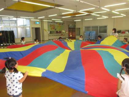 今年度から耐震上、遊戯室が使用できないため、小学校のランチルームをお借りして取り組んでいます。バルーンでは「パラシュートうまくできたね」「手はピーンと伸ばしてできたよ!」と言いながら、友達と一緒に楽しんでいます。