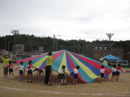 引き続きの全園児によるバルーンでは、お山やパラシュートをつくったり、元気に踊ったりして楽しみました。