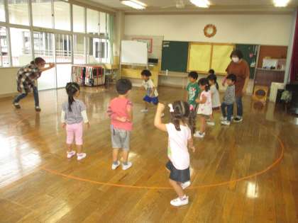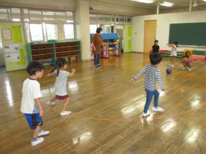 わくわくルームで転がしドッヂボールをして遊びました。円の中から出ないで転がってくるボールから逃げる、円の中に入らないでボールを転がす、ボールに当たったら円の外に出るなど、ルールを守りながらゲーム遊びを楽しみました。「ボールきた!きゃー!」と逃げたり「よし、当ててやる!」とボールを転がしたりして、楽しんでいました。今後も、ルールのある運動遊びを楽しんでいきたいと思います。