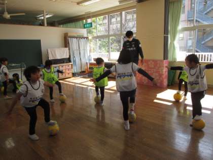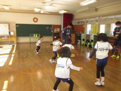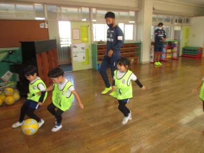 カターレのコーチにサッカーの指導をしていただきました。ドリブルをしたり、手を使わずに足でボールを止めたりと、難しそうにしながらも楽しんで取り組んでいました。