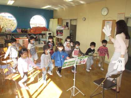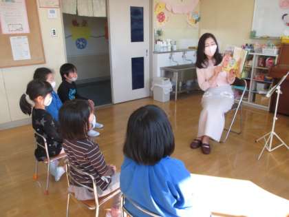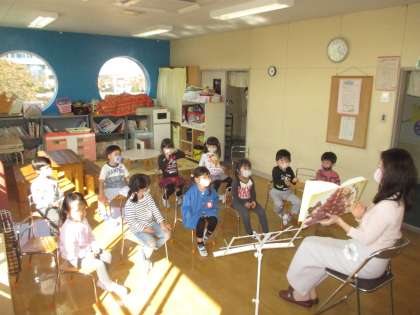 「荒川裕子音楽教室」の荒川先生のお話会がありました。3・4歳児には「おいもをどうぞ」5歳児には「いいから いいから」共通して「ぐりとぐらのえんそく」をそれぞれ読んでいただきました。リズムに乗ったセリフもあり、絵本の中の素敵な世界が心の中で広がっていきました。読み聞かせの後は、曲に合わせてリズム打ちも楽しみました。