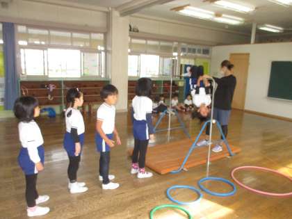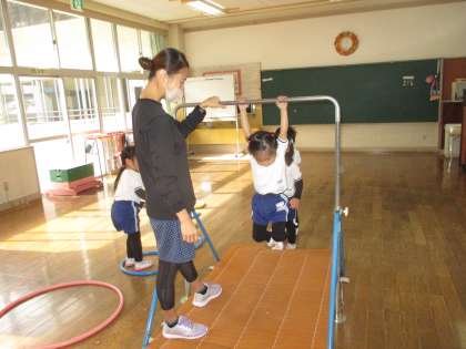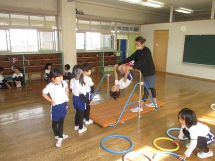 体操教室で鉄棒をしました。鉄棒にぶら下がったり、足抜き回り・腰抜き回りをしたり…。うさぎ組とひまわり組は逆上がりを教えてもらい「できるようになりたい」と意欲的に取り組んでいました。たんぽぽ組は、体を支えきれず、思わず手を放しそうになることもありましたが、講師の先生に支えてもらい、取り組んでいました。