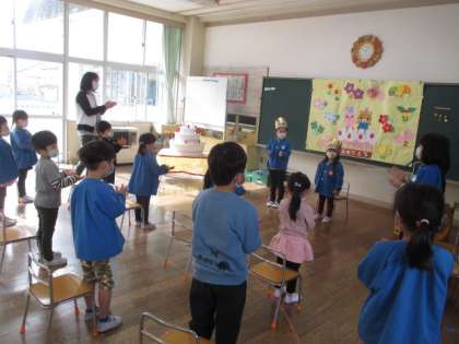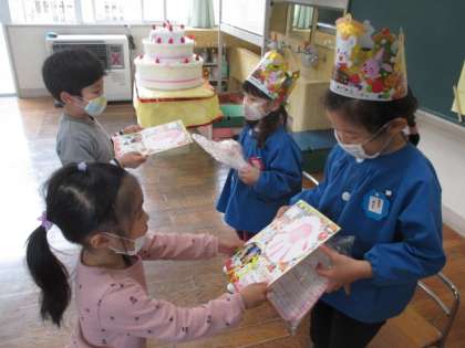 10月生まれの友達の誕生会をしました。インタビューコーナーで「大きくなったら何になりたいか」聞かれ「保育士になりたい」「ケーキ屋さんになりたい」と話していました。また、好きな友達からプレゼントをもらい、嬉しそうでした。