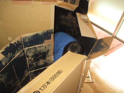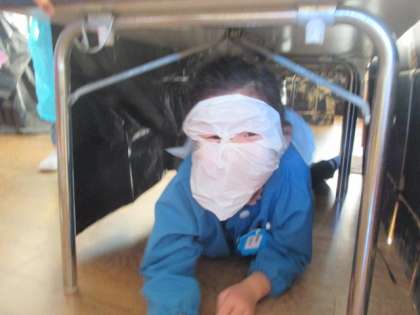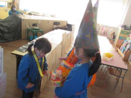 10月に入ってから少しずつ形にしてきたお化け屋敷に、やっと3,4歳児を招待することができました。お化け屋敷の周りでガタガタ音を鳴らしたり、怖いお化けになろうと仮装をしたりして驚かせていました。一方で、怖そうに来る3歳児に「一緒に行こう」とお化け屋敷の入り口まで案内する優しい姿も見られましたよ。出口では「頑張ったね」と自分たちでつくったカボチャのメダルと、昨日買ってきたお菓子を渡しました。お化け屋敷に入っていく時は硬い表情が見られた3,4歳児でしたが、出口まで来ると、ほっとした表情に変わっていました。
