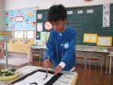 みんなで話し合いをして、今年の干支「いのしし」を書くことになりました。 筆で文字...