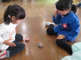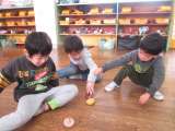 子供たちは、こま回しに挑戦しています。上手く回せるようになりたいと、何度も挑戦...