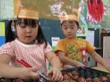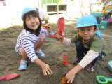 園庭に出て、バケツやボウルに土を詰めて型抜きしたケーキに、落ち葉を飾ってデコレ...