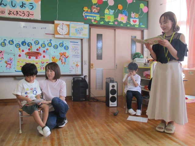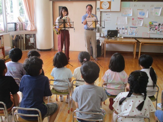 今日は8月生まれの誕生会がありました。誕生ケーキのロウソクの火を何度も「ふぅ~」とし、消えたときには拍手が起きました。お楽しみコーナーは前年度の修了児保護者による演奏会がありました。ホルンとトランペットの音色を聴き「さんぽ」の曲では子どもたちも一緒に口ずさんでいました。