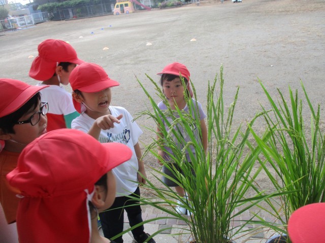 春先、校区の方の田植えの様子を見学させてもらいお土産に籾をいただいたので、園でバケツで育てています。ぐんぐん生長しお盆を過ぎたころには穂が出始め、今日久しぶりに稲を見た子どもたちは「えー!!大きくなってる!」「これがお米?」と不思議そうです。今からは、うまく育てば穂の中に栄養を貯めて米が大きくなっていくそうです。間近で観察し、いろいろな変化を発見している子どもたちです。