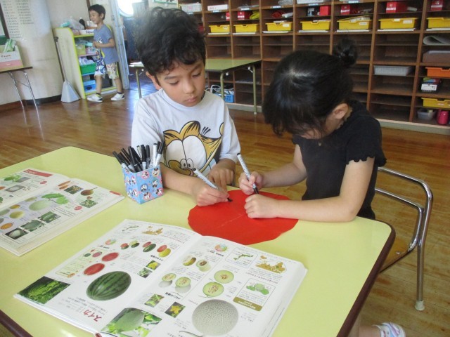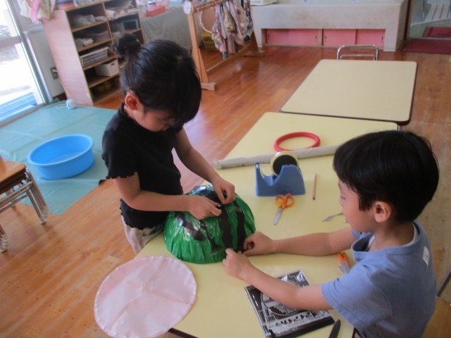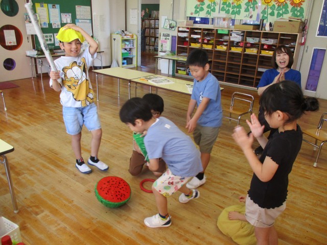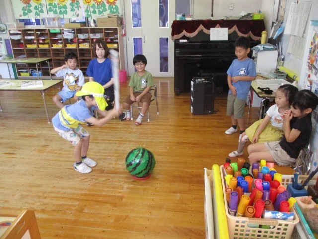 7月の登園日にビーチボールでスイカ割りをして楽しんだとき「割れたら面白いね~」という言葉から、割れるような仕掛けをつけたスイカを作りました。種や模様を描いて本物そっくりに!早速スイカ割りをして遊ぶと「パカッ」と割れると大歓声が起こりました。それと同時に、スイカに集まりガブガブと食べたり種を飛ばしたりする真似をして楽しんでいます。友達に進んでほしい方向を知らせるときも右、左だけでなく「左にちょっとだけくるん(と回って)」「3歩右に」と、具体的に知らせられるようになってきました。少し慣れてきたので距離を延ばしたり、最初に3回まわってスタートしたりして変化させて楽しんでいます。みんなで育てたスイカが美味しかったこともあり、スイカへの思いは大きいです!わいわい騒いで楽しんでいきたいです。