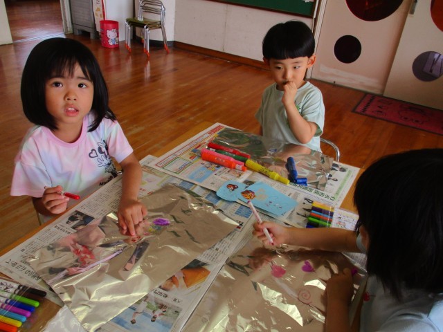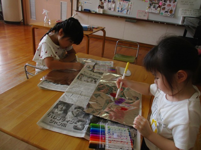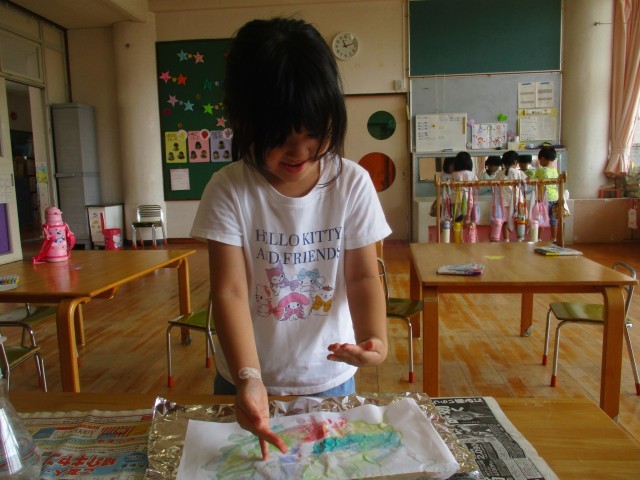 今日は、にじみ絵をして遊びました。水性ペンでアルミホイルに好きな絵を描き、霧吹きで水をかけ習字紙に色を移しました。色が混ざる様子や習字紙に色が広がる様子に不思議さを感じつつも、綺麗な色の染め紙ができ、嬉しそうにしていました。「にじみ絵だからにじの絵を描いたよ」「色が混ざってきれい」「もう一回やりたい!」とまだまだ遊びたい様子の子どもたちでした。にじみ絵を使って秋の作品を作りたいと考えています。何ができるかお楽しみに!
