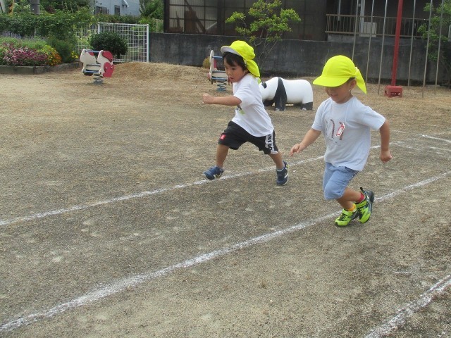 今日は園庭でかけっこをしました。笛の合図で走り出すと、見ている子どもたちからは「がんばれ~!」と自然と応援する声が聞かれほほえましく思います。