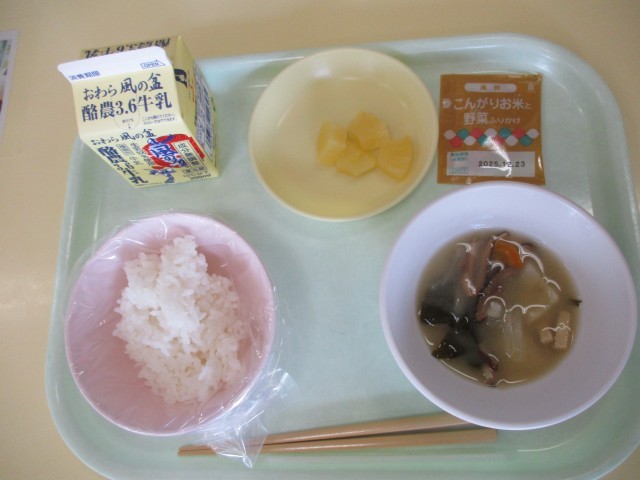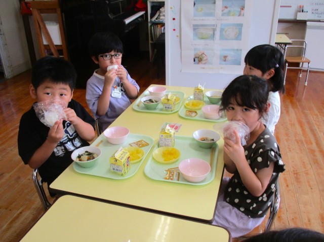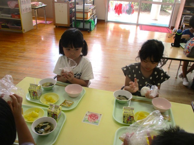 今日は「防災の日献立」ということで、栄養士さんから今日の給食が災害時を想定した献立内容になっていることを教えてもらいました。ごはんは、食器の代用品としてポリ袋を使い、ふりかけを入れて自分でおにぎりを作って食べました。ポリ袋に入ったご飯をギュッと握るのも初めてのことでしたがうまく出来上がったおにぎりに嬉しそうでした。「おにぎりおいしい!」「みそ汁おいしい!おかわりしたい」といつもとは雰囲気の違う給食でしたがモリモリ食べていました。また、お子さんから様子を聞いてみてくださいね。