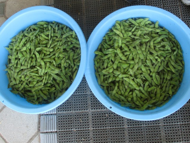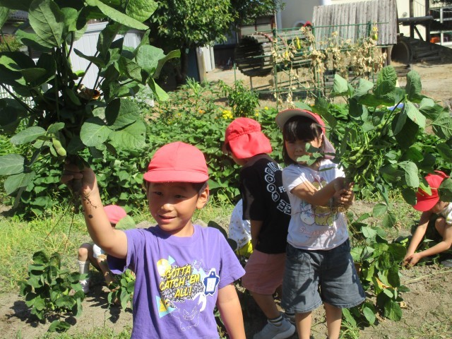枝豆がたわわに実って今日収穫しました。たくさん付いている枝豆に「100個は絶対にありそう」と言っていましたが、うさぎ組、りす組の友達にも手伝ってもらい全てのさやを取ると、なんとタライ2個分にもなりました。調理員さんにお願いして茹でてもらいおいしく食べることができました。枝豆をさやから出すのが初めての子もおり、食べ方を知らせますがピュ~ンと豆が何度も飛び出し可笑しくて笑いだす子どもたちでした。新鮮な枝豆をその日のうちにみんなでさやから食べる美味しさを味わうことが出来ました。枝豆好きが増えてくれると嬉しいです!
