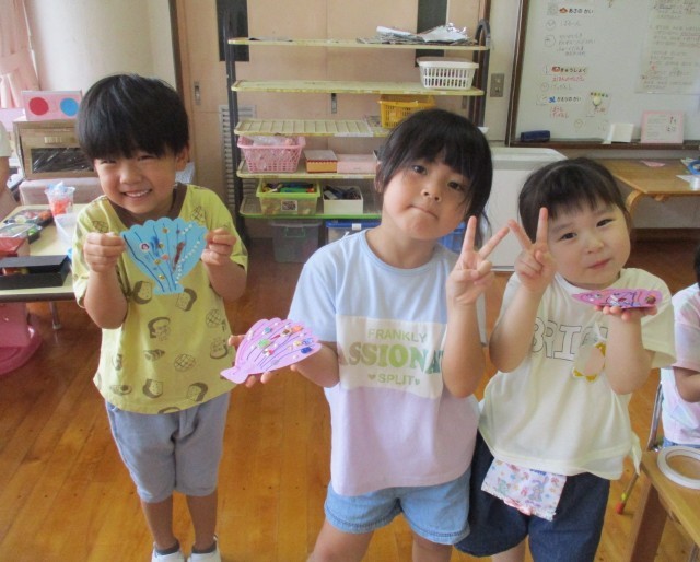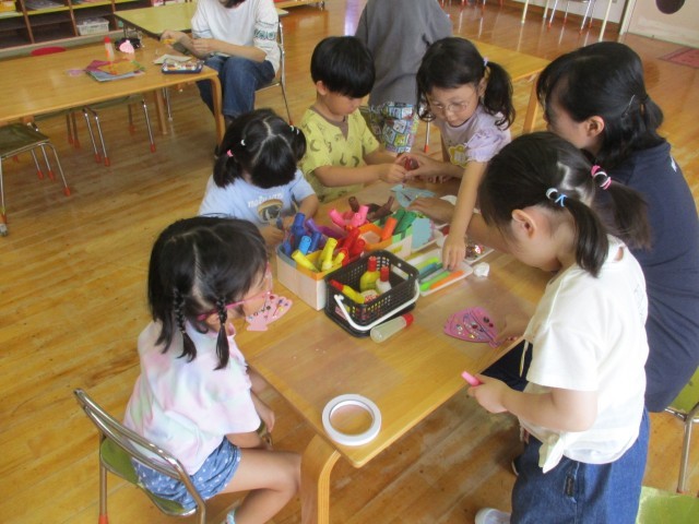 海の生き物に興味をもっている子が多く、貝殻の製作コーナーを設けました。友達がつくっている様子を見て「私もやってみたい」と友達から刺激を受けて遊ぶ姿が見られ、キラキラのペンやシールを使い、どんな模様にしようかと集中しながらつくっていました。できあがった貝をモビールのようにして飾ると「海の生き物つくって水族館をつくりたいな」「水族館にペンギンがいたよ」と友達同士の会話も弾み、想像を膨らませて楽しんでいます。