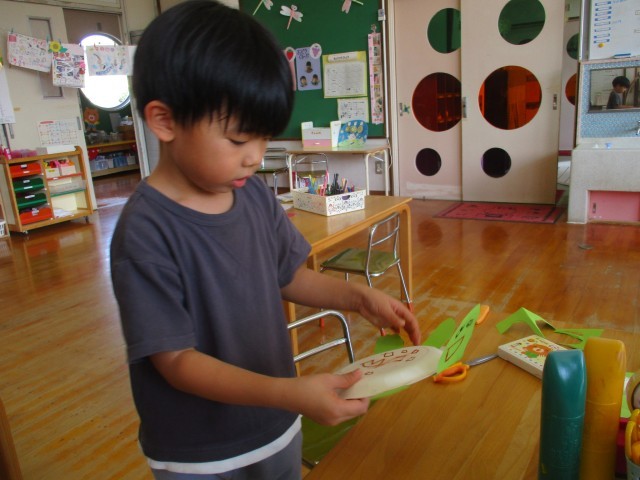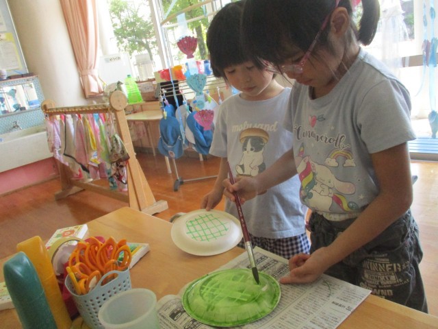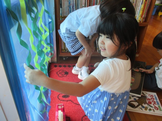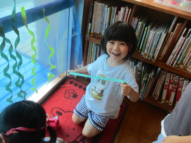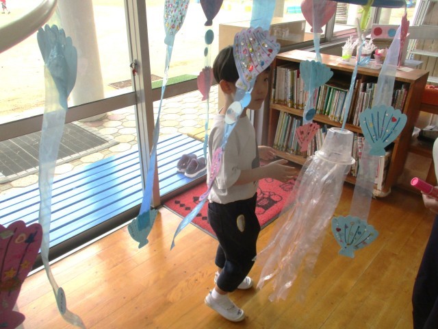 先日つくった貝を飾ると、貝の間を通り抜けたり、ゆっくり回る様子をうっとりと見たりして遊ぶ姿が見られました。「うさぎぐみに海をつくってみる?」と聞くと「つくりたい」とのことで青いカラーポリを窓に貼りました。緑の紙テープをねじりながらつけていくと海らしくなり「海藻だ!」「ここに魚が泳いだらいいかも」「カメをつくって泳がせたい」と子どもたちのイメージが膨らみ、カメづくりが始まりました。「カメってどんなんだったけ?」「へそがあるんだね!」と本で確認し、新たな発見をしながら思い思いにつくって楽しんでいた子どもたちです。これからどんな海の生き物が増えるか楽しみです!