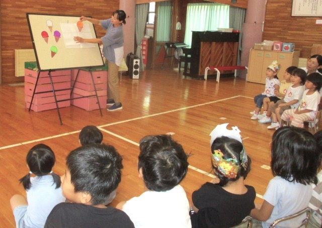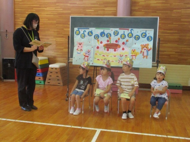 9月の誕生会 公開日 2025/10/01 更新日 2025/10/01 今日のできごと 9月30日(火) 9月生まれの友達の誕生会がありました。ドキドキしながらも友達の質問にじっくり考え答ようとする姿をみんなで見守りお祝いしました。年長児は、お母さんからのお祝いの言葉に照れているのも可愛かったです。 お楽しみコーナーは、子どもたちが大好きなアイスクリームのパネルシアターを見ました。「アイス食べたくなったね~」と話す子どもたちでした。