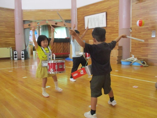 鼓隊ごっこ(3・5歳児) 公開日 2025/10/01 更新日 2025/10/01 今日のできごと 10月1日(水) りす組さんが手作りの太鼓やシンバルを見せてくれ、年長組と一緒に演奏をしました。よく見てくれていたことからバチを上げるところやシンバルで回るところも真似できていて驚かされました。また、年長児は楽器の交代をして演奏しました。パート紹介のリズム打ちも揃ってかっこよかったです。楽しかった運動会の余韻を十分味わっていきたいです。 +2