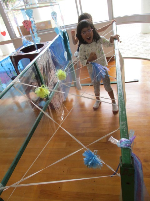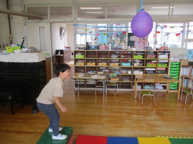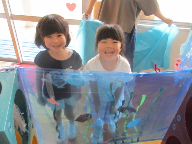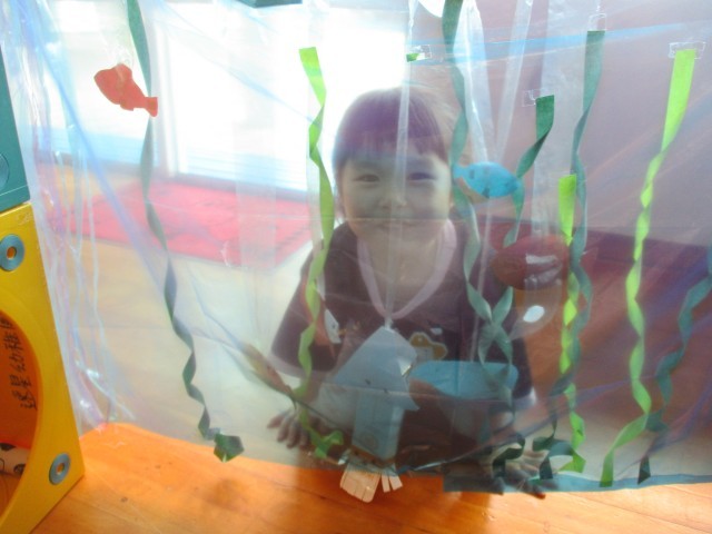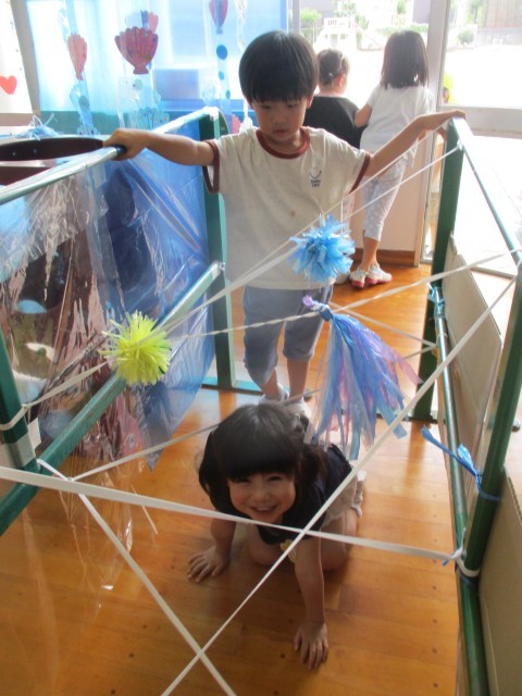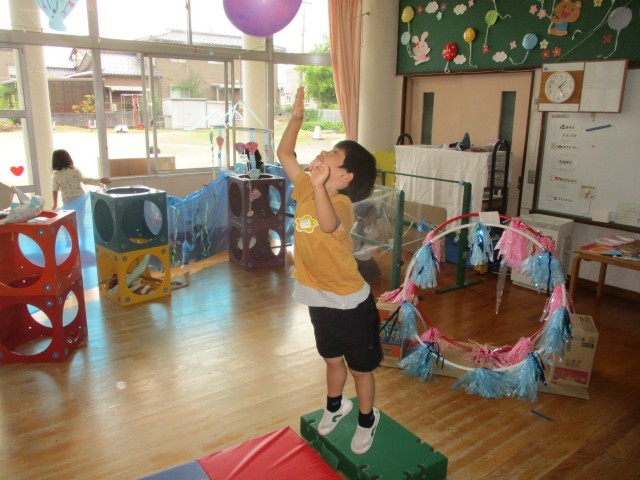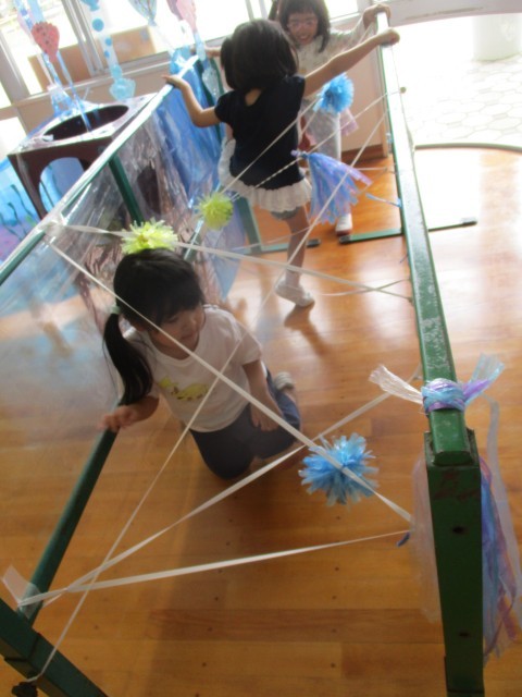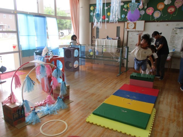 部屋に水族館をつくりたいという子どもたちの思いから、少しずつ海の生き物が増え、水族館の雰囲気になってきています。ゴムくぐりやイルカジャンプコーナーが増え、サーキット遊びをしました。「ゴムに当たるとビリビリ(電気が流れる)ってなるよ」とゴムに当たらないようにそっとまたいだり、四つ這いで進んだり、様々な身体の使い方で通り抜けていました。ジャンプコーナーでは風船にタッチしようと力いっぱい跳び、何度も繰り返し楽しみました。「楽しかった」「明日もやりたい」と満足気に話す一方「もっと海を増やしたい」「魚もつくりたい」と話す子どもの姿も見られました。これからどんな風に遊びが広がっていくのか楽しみです。