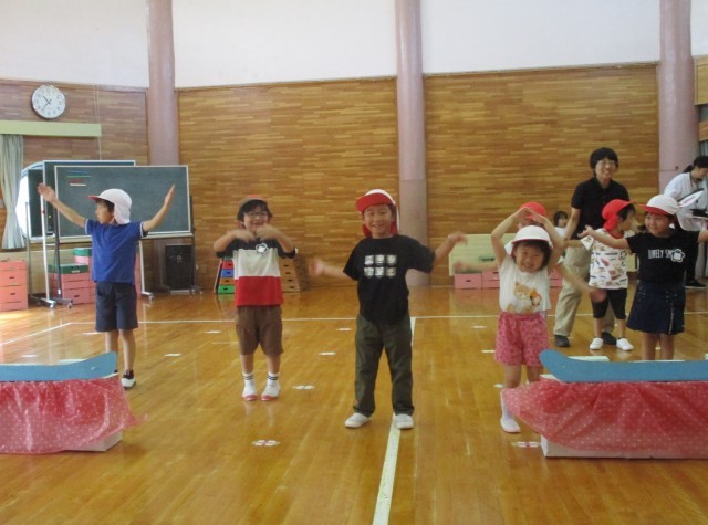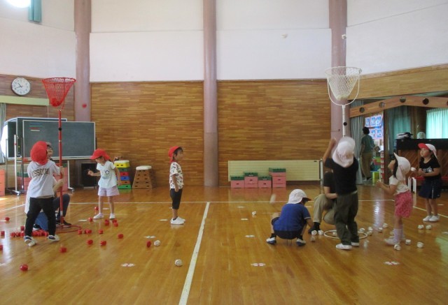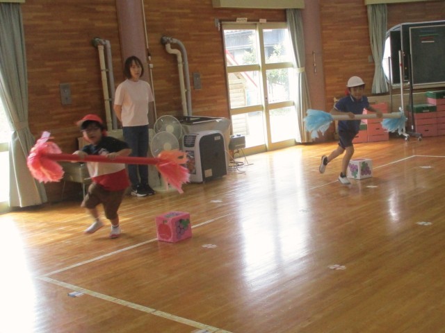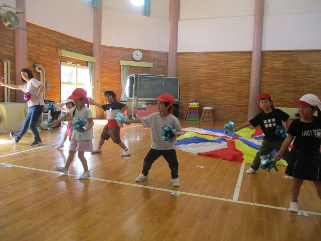 今週は、運動会の楽しかったことや自分たちの頑張りを振り返りながら余韻を楽しんできました。今日は、プログラム全部を年長組だけでやってみました。年下の友達のリズムやバルーンもよく見ていたことで楽しそうに踊ったり歌ったりしていました。また、小学校の玉入れを見学してきたら,かごの高さが高いことに気づき「それならぞう組もやってみよう!」とかごを高くして挑戦しました。綱引きなどの勝負前には応援の声も大きくかっこよかったです。