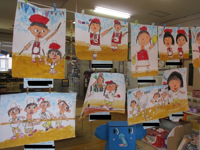 楽しかった運動会の絵はあっという間に描きあげることができ驚かされました。まだまだ描きたい!気持ちから鼓隊の絵、鼓隊以外の絵と一人2枚描きました。子どもたち頑張りや楽しかった満足感があふれていますので、ぜひご覧ください。