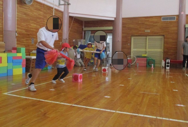 年長組は、準備体操、玉入れ、綱引き、折り返しリレー、フォークダンス等、運動会ごっこを一緒にしました。踊りでは照れくさそうでしたが、子どもたちの可愛さに後押しされ楽しそうにお踊る姿が印象的でした。この後、2クラスの訪問があり、園児にとってもいろいろな人にかかわる機会となりそうです。