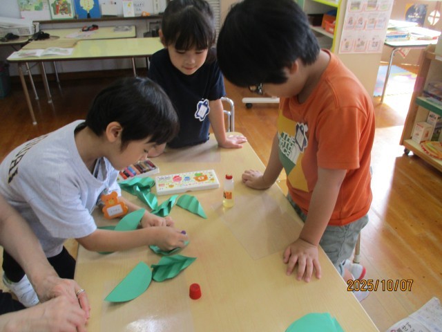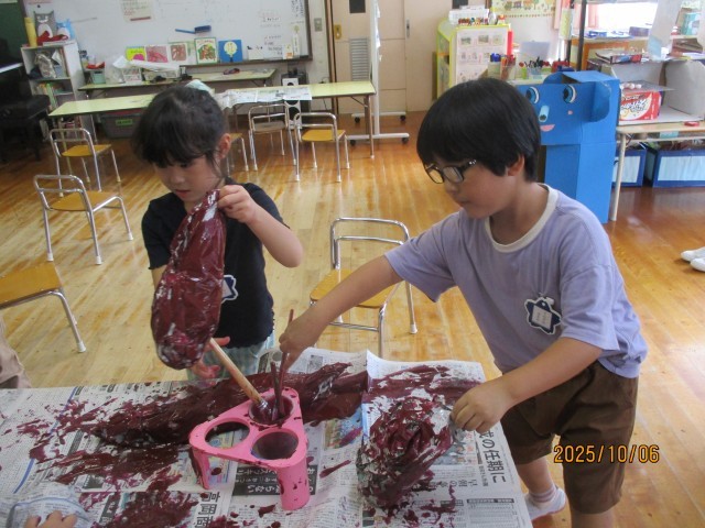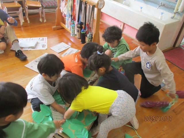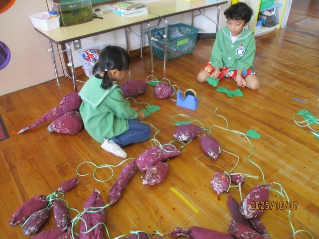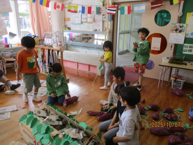 サツマイモの収穫を前に「こんなサツマイモがあったらいいなぁ」と新聞紙で芋を作りました。大きな芋や長い芋、形も様々です。せっかくなら「芋掘りもやりたい!」という子どもたちの声から、段ボールを畑のようにして芋掘りごっこができるよう準備中です。今日は、一旦できたところで芋掘りをしてみると、つなげたはずの芋がはずれて1個しか取れなかったり、3個も取れたりなど、芋の数に興奮していた子どもたちです。最後は新聞の土を掘って芋探し!もっと楽しくなるためにアイディアを出し合っています。