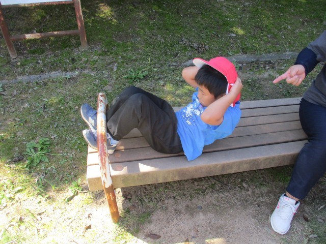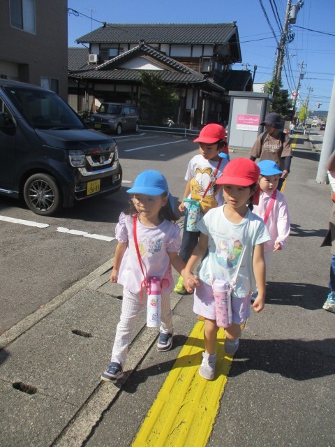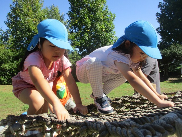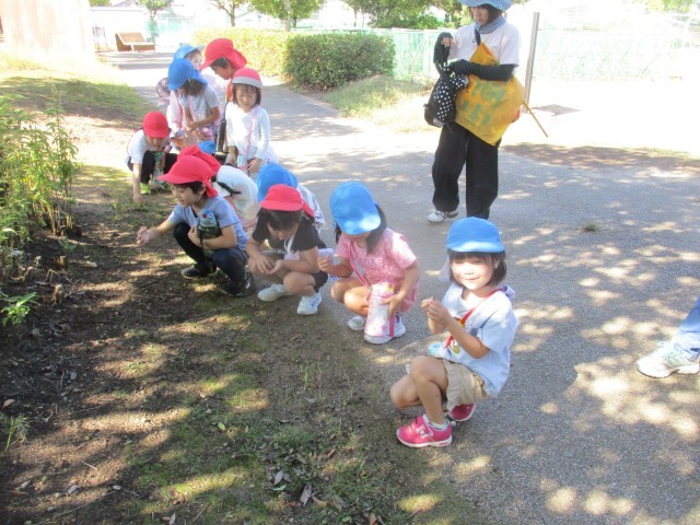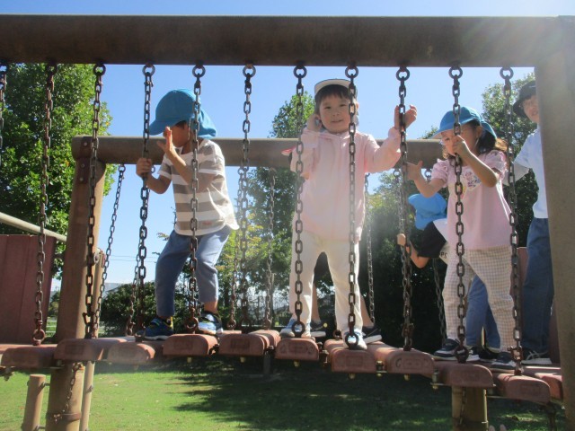 道中では、中学生が運動しているのを見ながら楽しく歩いていた子どもたちです。公園についてからはアスレチックで体を動かして遊び、ドングリ拾いや虫探し等、秋見つけも楽しみました。