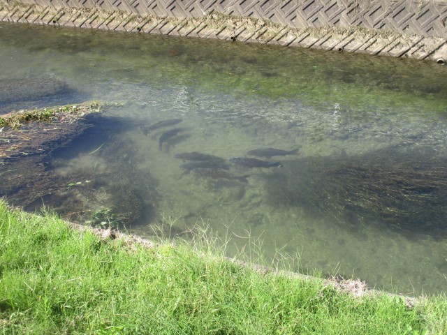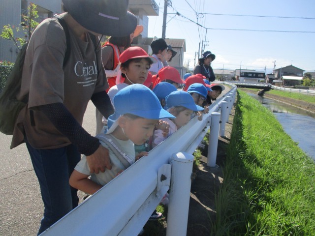 心地よい秋晴れの中、スポーツプラザへ散歩に出かけました。坪野川に沿って歩いていると今日は魚がいっぱい!「あ、小さいの見えた!」「もっと大きい魚がたくさん来た~!」と少し進むたびに立ち止まって魚の様子を観察していると最後には鯉の大群に出会い、跳ねる姿や何度も周回する様子に驚いていました。