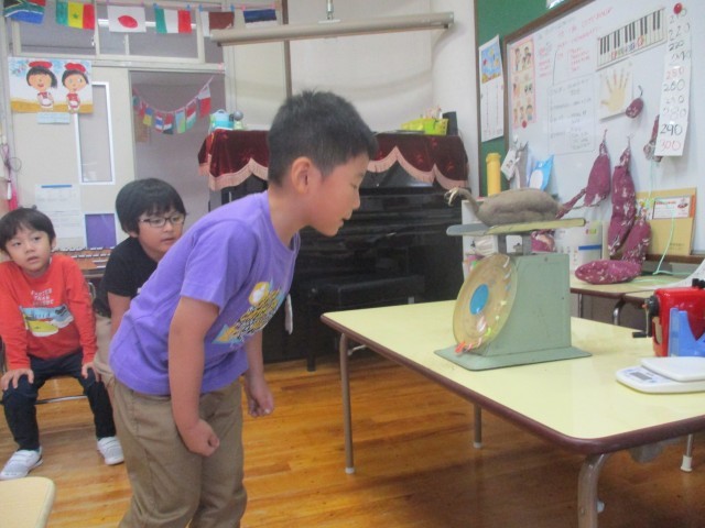 午後からは、サツマイモのチャンピオンを探して遊びました。「どんなチャンピオンがあるかな?」と投げかけると、重さ、軽さ(小ささ)長さ、太さの4つを決めることに・・・。はかりを使って重さを測ったり、芋を並べて長さを比較したり、太さはひもを巻いてその長さを比べたりしました。見た目とは違う結果になった芋もあり面白かったです。