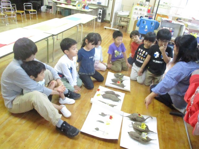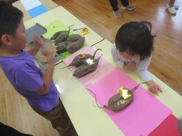 最後はお気に入りの芋を選び、その理由を聞いてみると「家族4人で食べれそうだから」「甘くておいしそうだから」「ねずみの形に似ているから」「この形がかわいいと思ったから」とそれぞれ選んだ視点に感心したり笑ったりして、楽しい活動になりました。