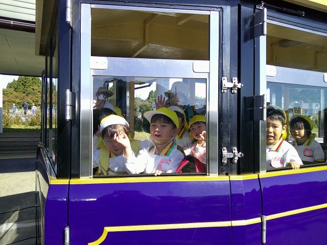 秋晴れの中、遠足に行ってきました。年少はトレーンに乗ってこどもみらい館へ。車内では松ぼっくりや栗が落ちている様子を見つけたり、水が張ってないプールに驚いたり発見を楽しんでいました。