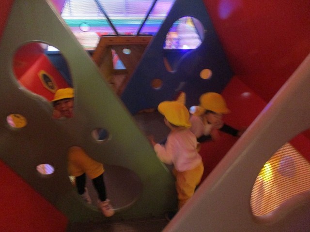 こどもみらい館内ではいろいろなトンネルや網を歩いたり下の階を覗いたりしながらたくさん遊びました。「早くお弁当食べたい」と楽しみにする声も聞かれ、愛情たっぷりのお弁当を喜んでいました。