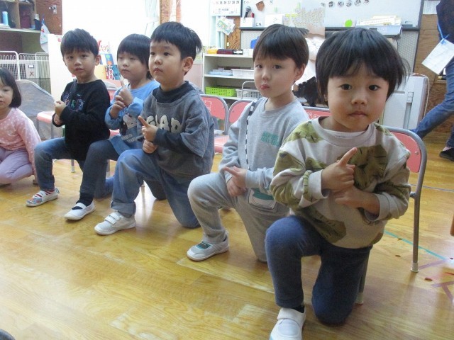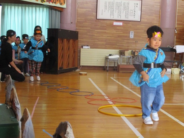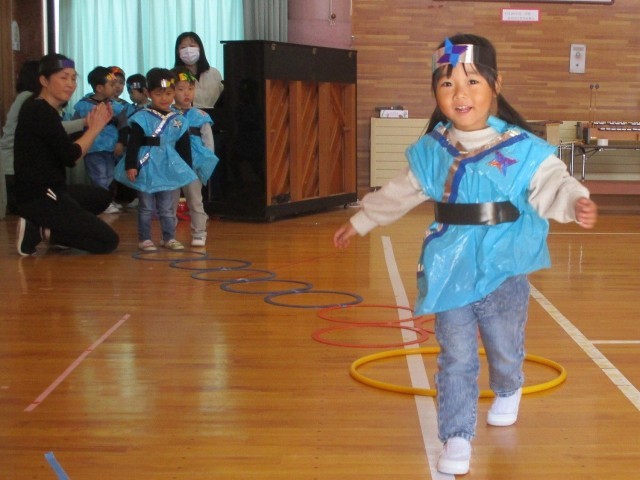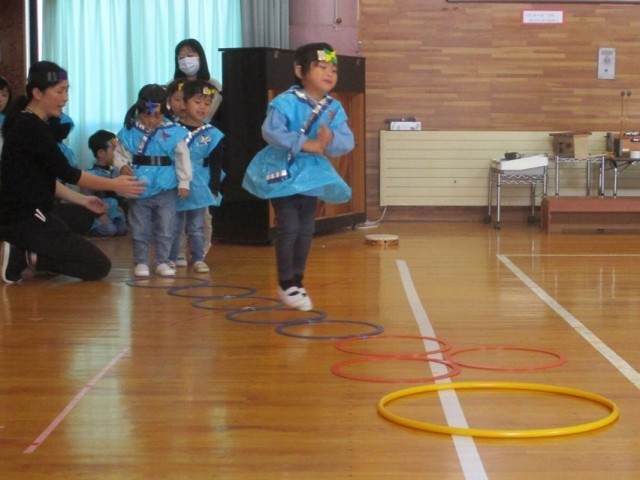 もうすぐ初めての発表会!忍者になって修行を楽しんでいます。いろんなポーズをしたりジャンプをしたり張り切っています。明日は「壁に変身の術、頑張る」「全部、頑張る」など子どもたちなりに頑張りたいことを考えています。