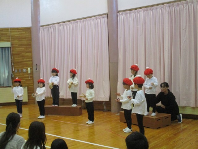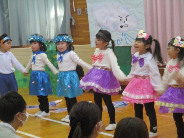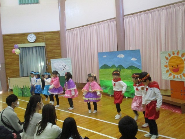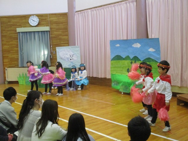 今日は子どもたちの待ちに待った生活発表会でした。たくさんのお客さんを前に緊張するかと思われましたが、おうちの方々に見てもらうことを楽しみにし、わくわくしながら自分たちの出番を待っていました。本番は、みんなで心を一つに歌や合奏をし、劇遊びでは自信をもって大きな声でセリフを言ったり、元気に踊ったりする姿が見られ、子どもたちの頑張りと成長がうかがえました。これまで、発表会に向けて友達と一緒に表現する楽しさを感じながら、たくさん練習してきました。ご家庭でも子どもたちの頑張りを褒めていただけたらと思います。今日はご参加くださり、ありがとうございました。