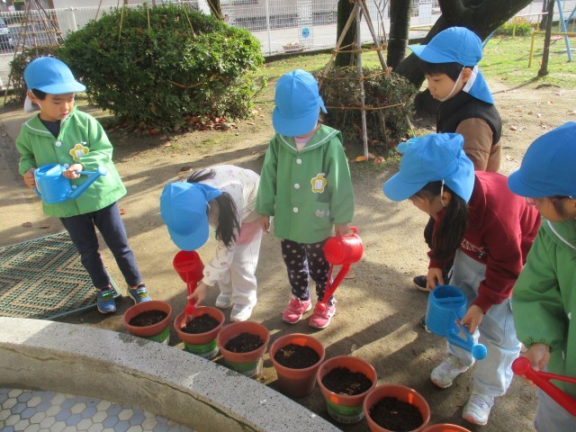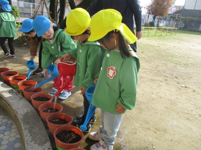 優しく土のお布団をかけた後は水やりをしました。次の春、1つ学年が大きくなったときに咲くことを伝えると「楽しみ~!!」とワクワクとした表情で話す子どもたちでした。
