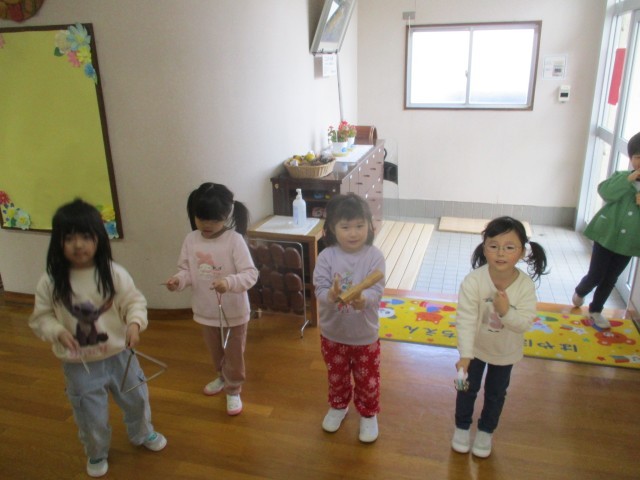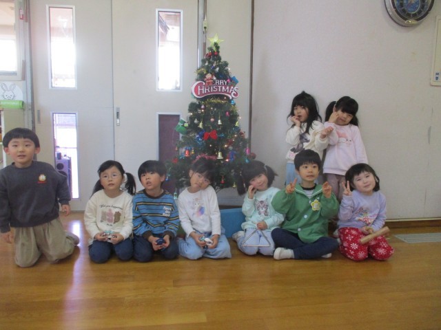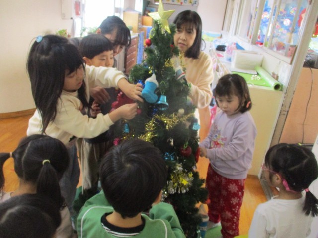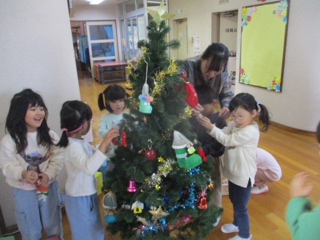 12月に入り子どもたちは「もうすぐクリスマスだ!」と楽しみにしている声が聞かれます。「ツリーの飾りつけをしたい!」と飾りをいっぱいにつけ、ツリーを華やかに彩りました。最後に電飾をつけると「わぁ~きれい!!」と目を輝かせていた子どもたちでした。また、クリスマスの曲に合わせて歌ったり、楽器を鳴らしたりし、友達と一緒に演奏会も楽しみました。