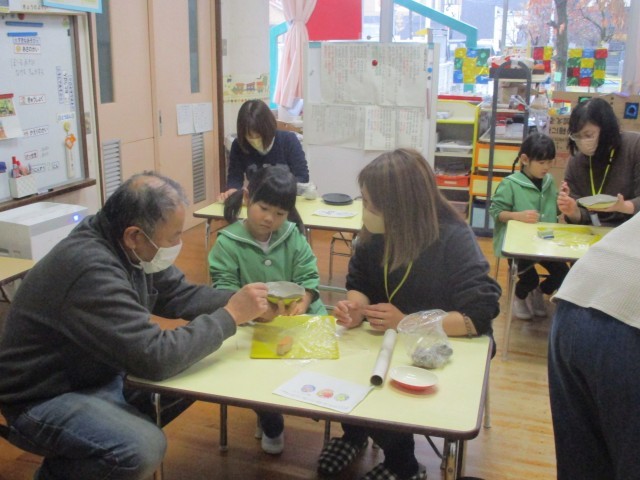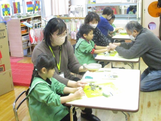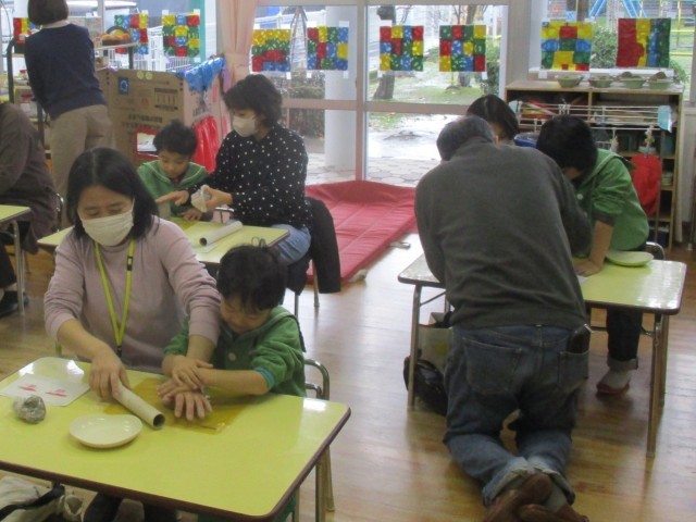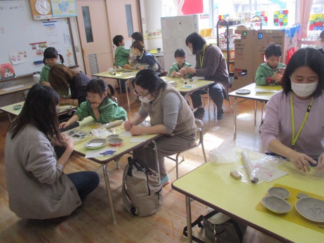 今日は、三助焼窯元の谷口先生に来ていただき親子で皿や箸置きづくりを楽しみました。難しい部分もありましたがお母さんと力を合わせて思い思いの作品をつくっていきました。形ができると、絵を描いたりハンコを押したりして更に素敵になりました。「絵がうまく描けてよかった」と安心する子や「粘土、ペタペタして気持ちよかった!」と話す子もおり、楽しい活動となったようです。焼き上がりは来年1月の予定です。どんな風に出来上がってくるか楽しみですね!