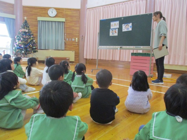 今日は12月の生活・保健指導がありました。生活指導は「進んで片づけをしよう」保健指導は「体を動かして遊ぼう」をテーマにし、子どもたちと体を動かすことの大切さやどんな遊びがあるか、片付けの必要性などを一緒に考えました。