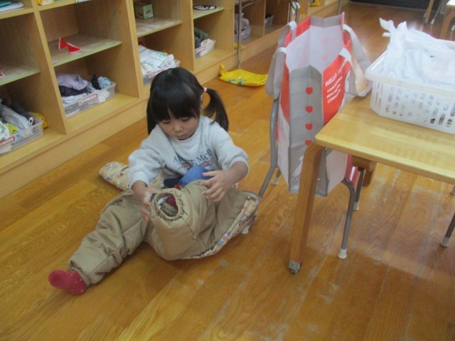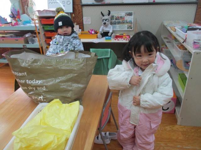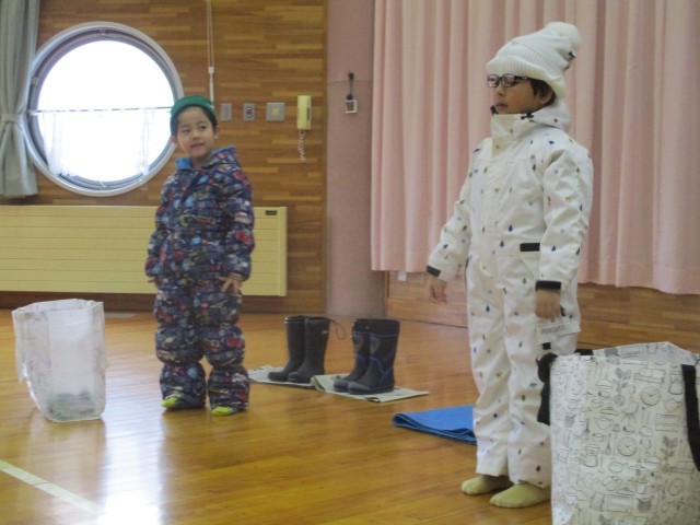 今日は生活・保健指導で雪遊びの話を聞き、去年の雪遊びを思い出しながらスキーウェアの着方を年長児に教えてもらいました。年少児は部屋に戻ったあと、スキーウェアの着用に挑戦していました。「雪遊びしたいな」と雪遊びを楽しみにしている子どもたち。雪が積もったら十分に楽しみたいと思います。