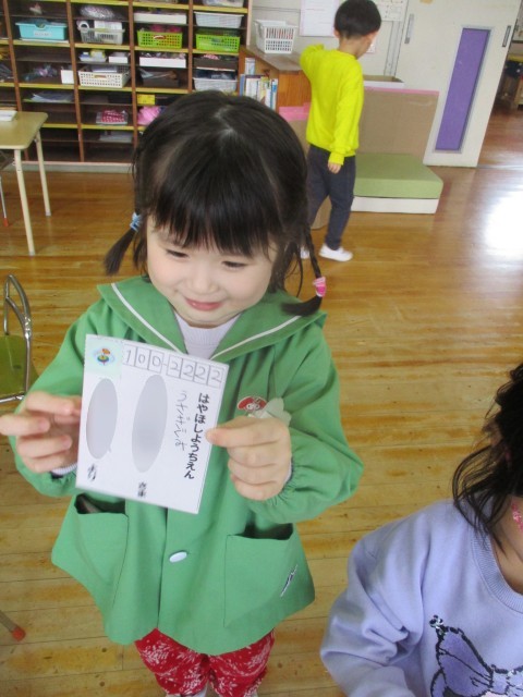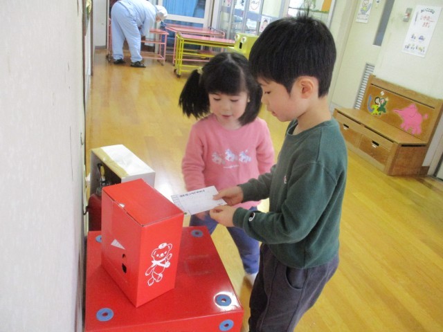 郵便ごっこやコマ、かるた等の正月遊びをして遊んでいます。郵便ごっこでは、心を込めて一生懸命描いたはがきをポストに入れる瞬間がとても嬉しそうな子どもたち。「届きますように」と言いながら入れる姿が微笑ましかったです。また、友達からはがきが届くと目を輝かせ、何が書いてあるかじっくりと見ていました。