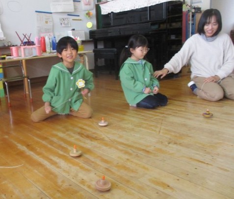 コマ回しでは、クリスマスにサンタさんからもらった糸引きゴマで友達と競争しています。初めは糸を巻くのも難しかった子どもたちですが、だんだんコツをつかんで上手に回せるようになり「もう一回やろう!」と繰り返し楽しむ姿が見られます。今ならではの遊びを存分に楽しんでいきたいと思います。
