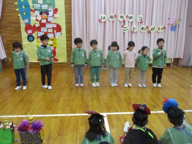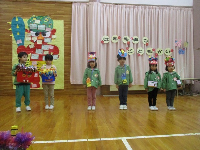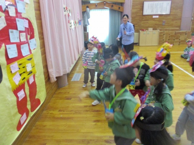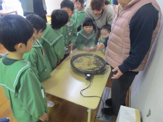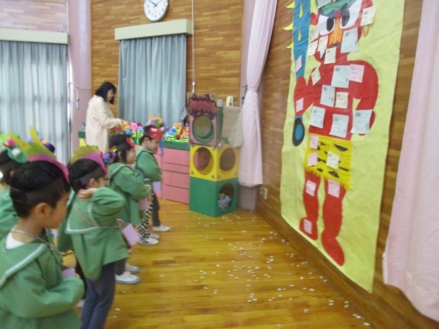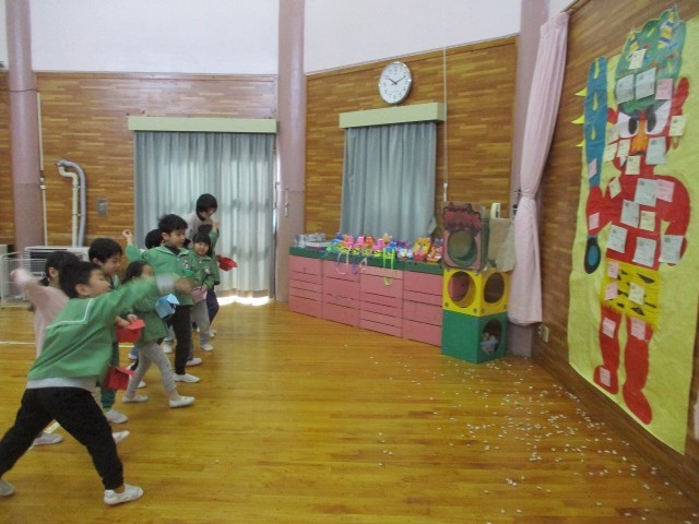今日は節分。登園後、廊下には炒った豆の良い匂いが漂い、子どもたちが集まってきました。春を待つ子ども会があり、集会では子どもたちがつくったお面や退治したい心の中の鬼の紹介をしました。それぞれに心の中の鬼を退治しようと気合十分!みんなで豆まきをしました。また、節分の由来を聞いたり、実際に「やいかがし(ヒイラギイワシ)」を見たりゲームも楽しみました。
