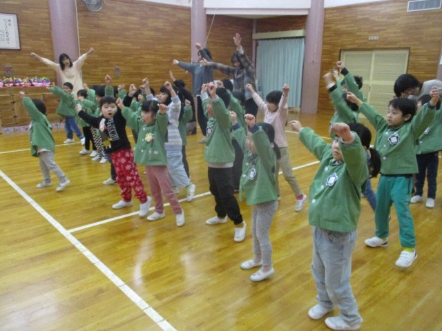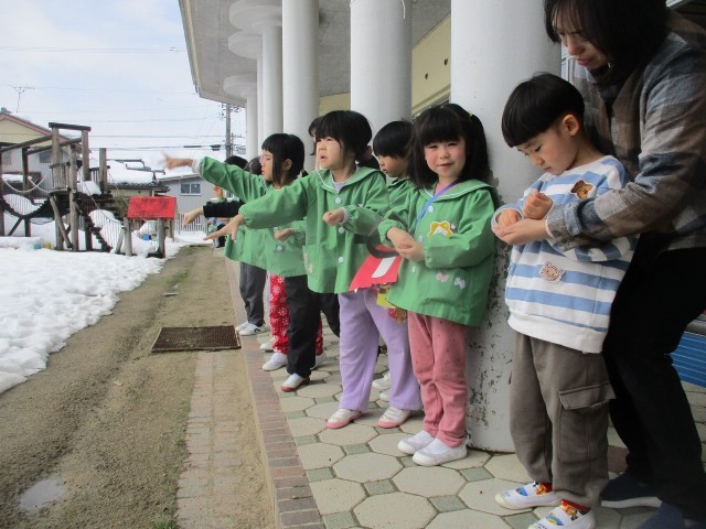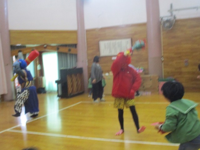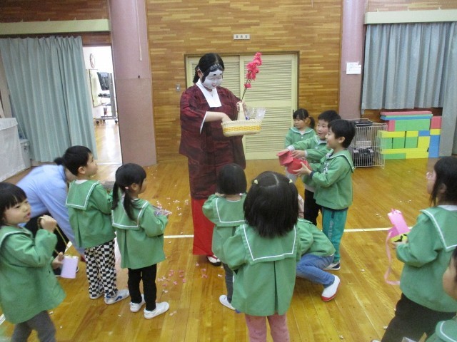 年長・年中児は去年の経験から途中で「鬼がきたらどうする」とドキドキしている様子も見られました。鬼が登場すると、鬼に向かって豆を投げたり、怖くて端に集まったりそれぞれでしたが鬼を退治し、ほっとしたところに福の神様が来られおいしいものもいただき一安心の様子でした。集会の終了後は各クラスの園庭に向かって豆をまき、鬼を退治しました。雪は残りますが、暦の上では春です。元気に過ごしたいですね。