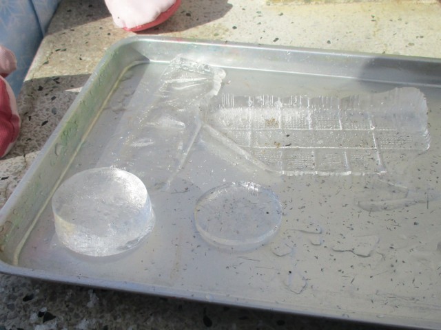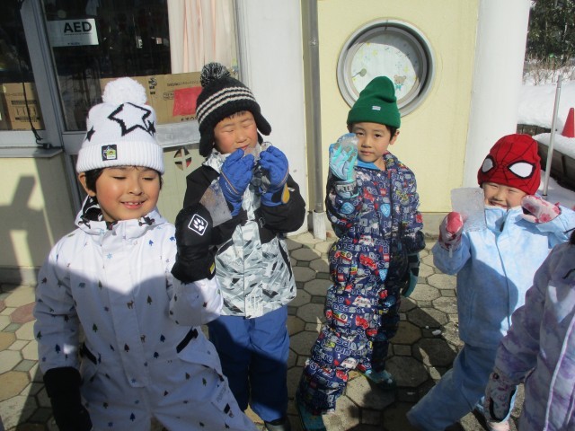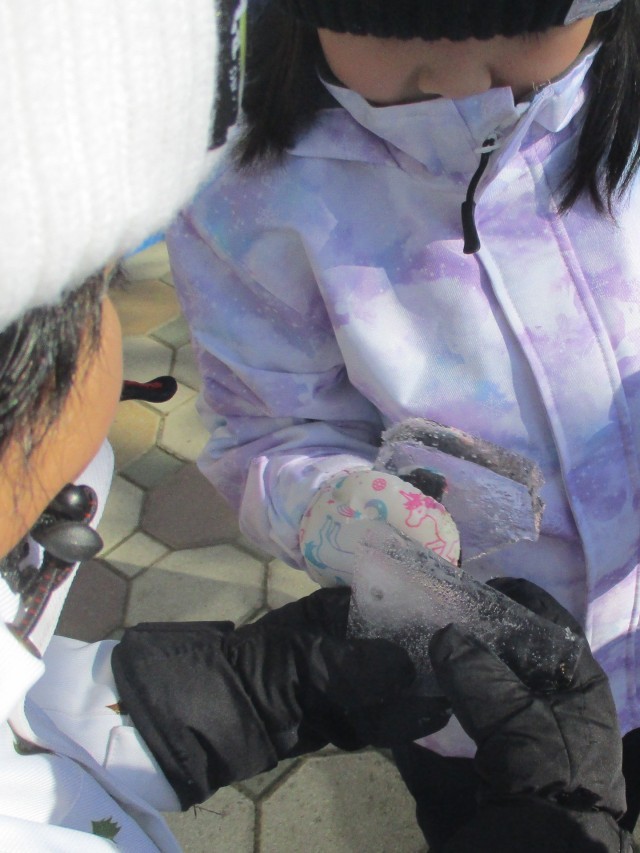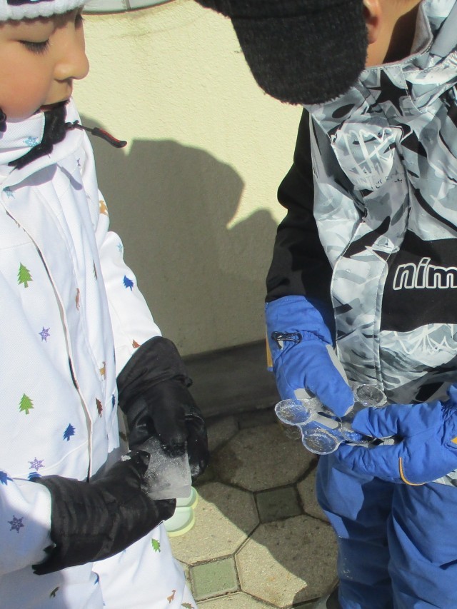 前回の氷づくりの経験から、氷ができそうな場所を考え雪の上や、雪に埋めるように容器を置いていく子どもたちでした。「やった!氷できとった」と喜ぶ声が聞かれ、容器から取り出してみると「こんな形すごい!」「ギザギザの模様ある」と、氷を見て気づいたことがたくさん!容器が斜めになっていたのか、氷も斜めになっていたり、容器の模様や形がそのまま氷になっていたりしました。また、厚さの違いにも気づき、友達と比べていました。氷の形もいろいろ…氷って面白いね!